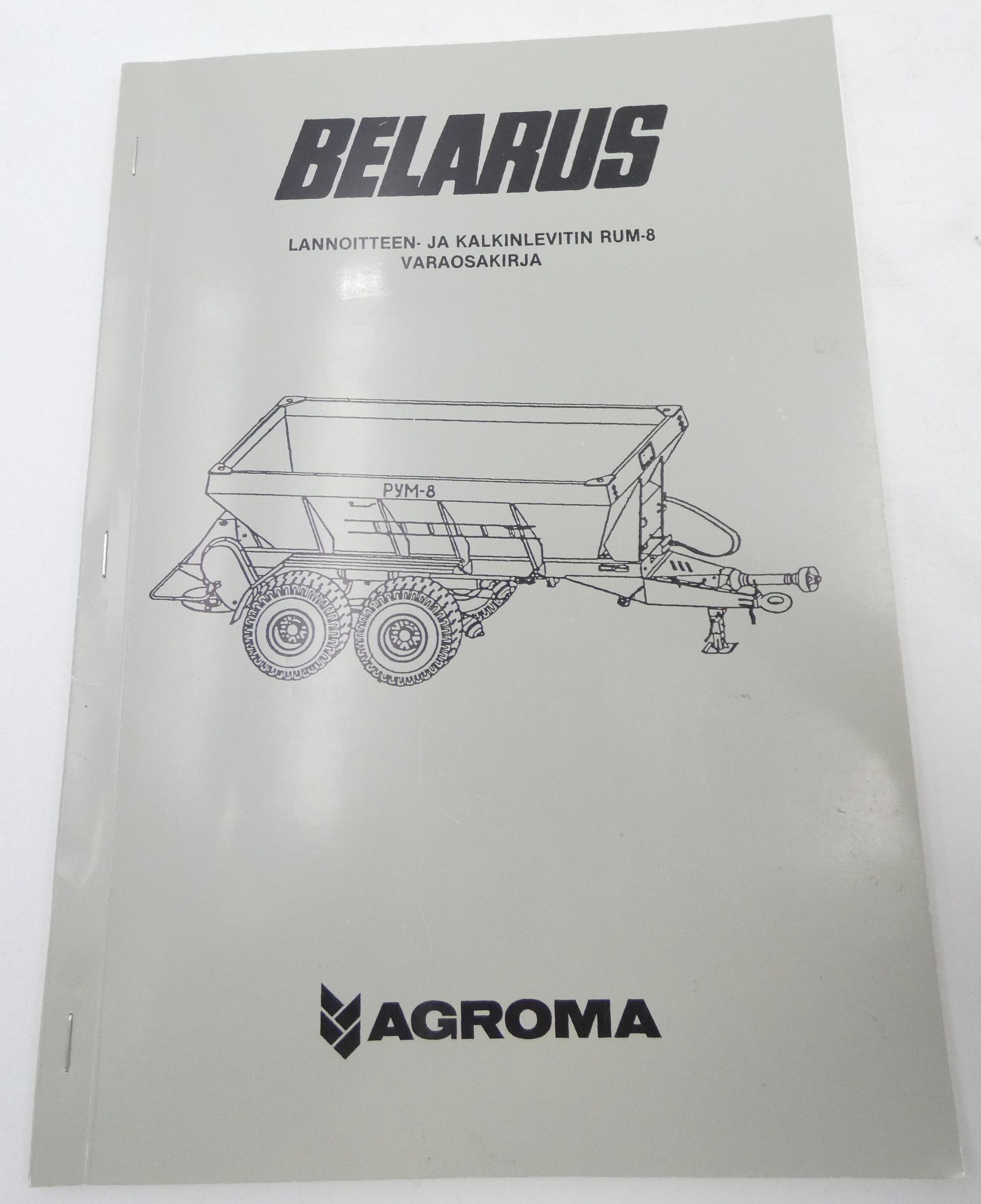 Belarus PYM-8 -lannoitteen- ja kalkinlevittimen varaosakirja.