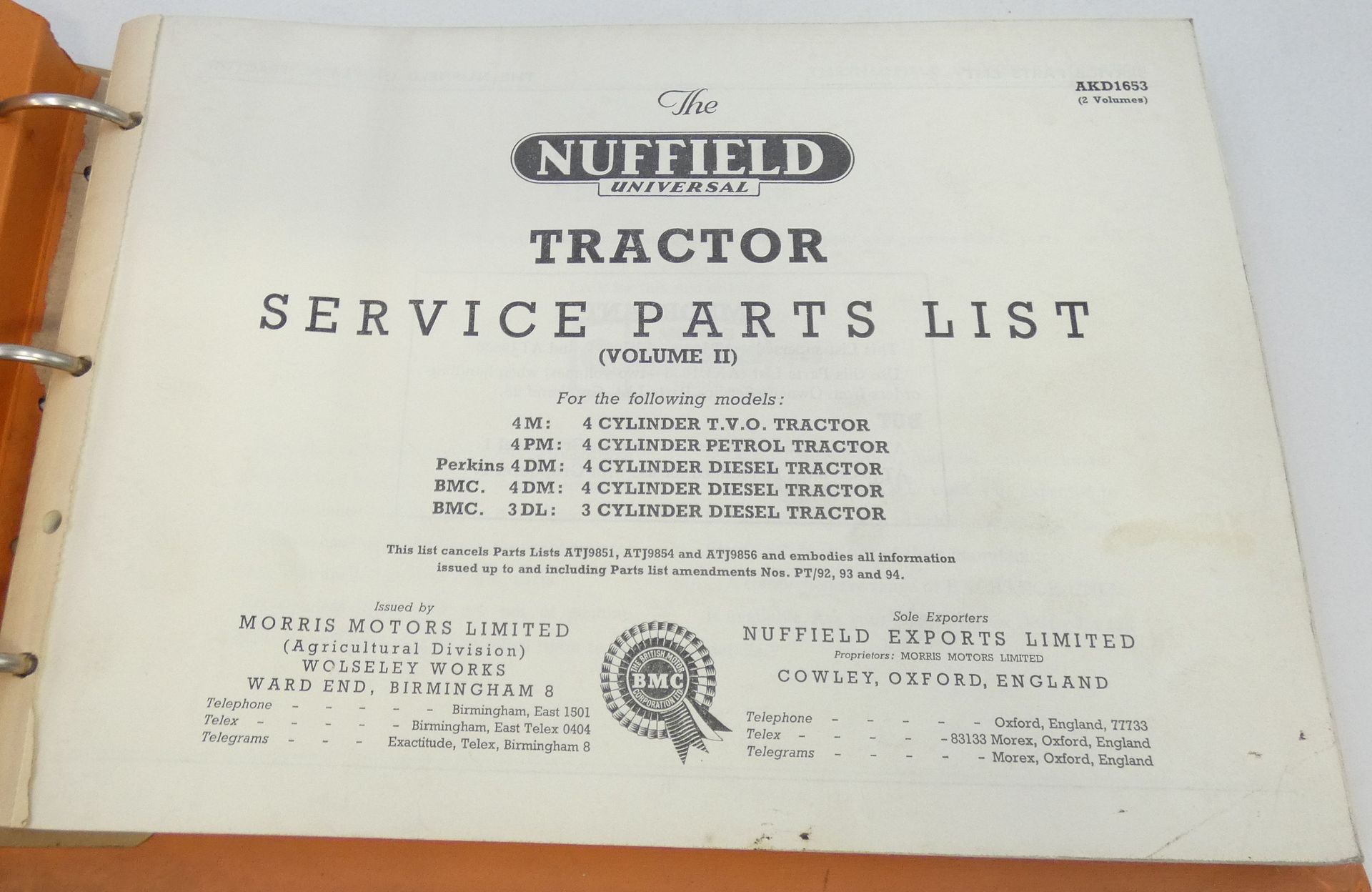 Nuffield Universal tractor 4DM, 3DL, 4PM, 4M and 4DM service parts list volume II.