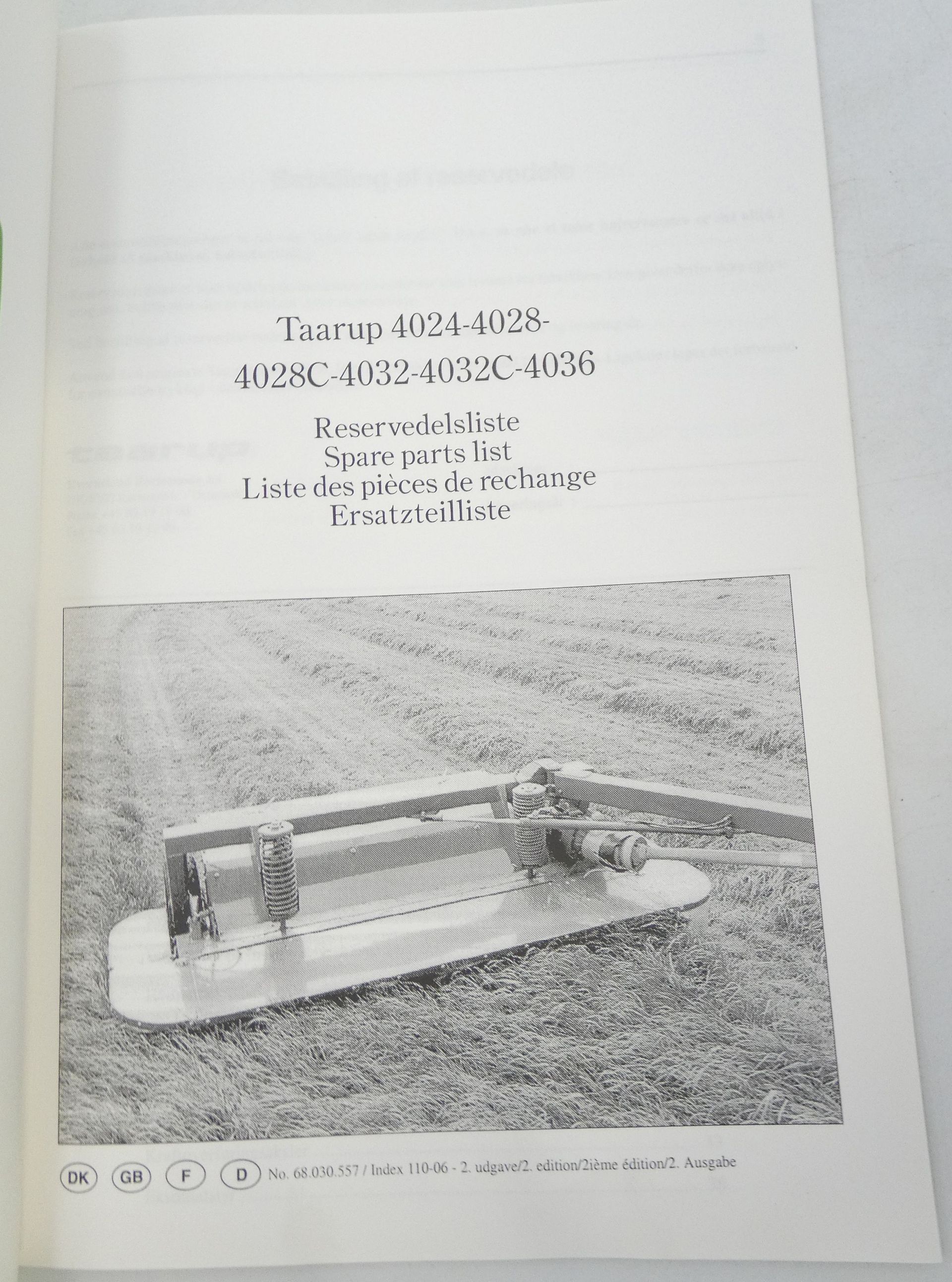 Taarup 4024, 4028, 4028C, 4032, 4032C and 4036 mowers' spare parts list.